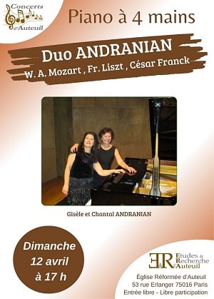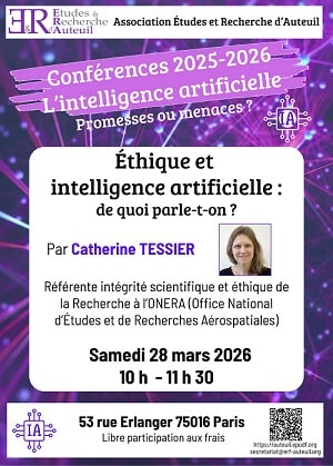 "Éthique et intelligence artificielle : de quoi parle-t-on ?" une conférence de Catherine Tessier le 28 mars de 10h à 11h30. Concert de piano à quatre mains donné par Gisèle et Chantale Andranian le dimanche 12 avril à 17h. Église réformée d’Auteuil (75016).