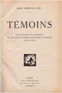 Jean Norton Cru (1879-1949), a pastor’s son and teacher of French literature, who had spent 28 months in the trenches, sorted and assembled three hundred testimonies about the war in a book entitled Témoins (Witnesses) deemed an ‘anti-war weapon’ in 1929. J.N. Cru was thus the first archivist of the trenches and hoped ‘to exclude a number of “phony” witnesses and true liars’.