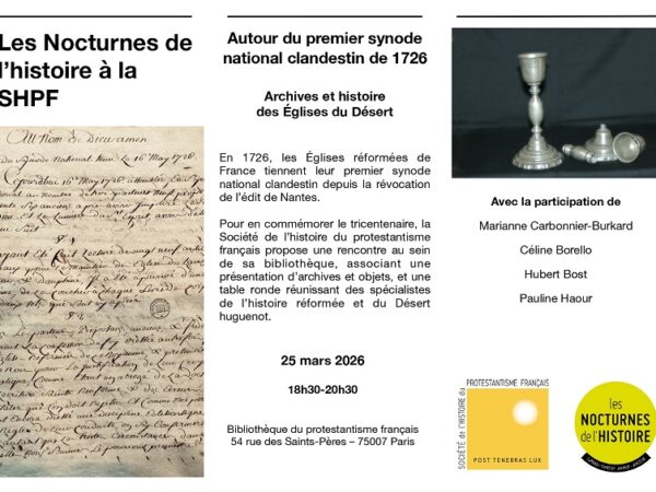 Pour commémorer le tricentenaire du premier synode national clandestin de 1726, la SHPF propose une rencontre au sein de sa bibliothèque associant une présentation d’archives et d’objets et une table ronde réunissant des spécialistes de l’histoire réformée et du Désert huguenot. Le 25 mars 2026, 54 rue des Saints-Pères (75007 Paris).